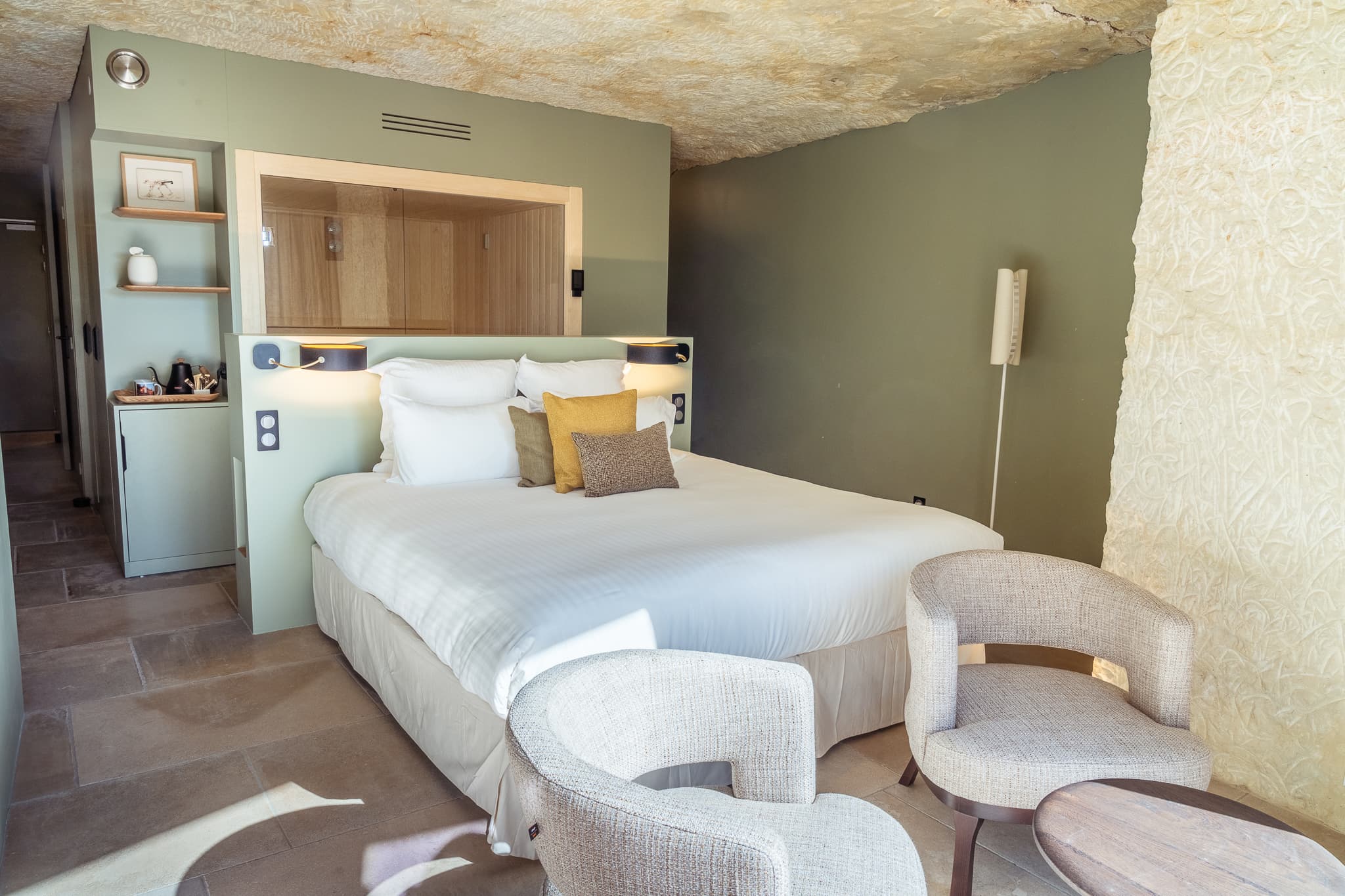 Nos 4 nouvelles suite contemporaines vous offrent une expérience unique alliant confort et matériaux authentiques. Situées en hauteur à flanc de coteau, exposées sud, sud-ouest, elles ont été récemment creusées dans le tuffeau et sont inondées de lumière. La température intérieure y est constante tout au long de l’année .