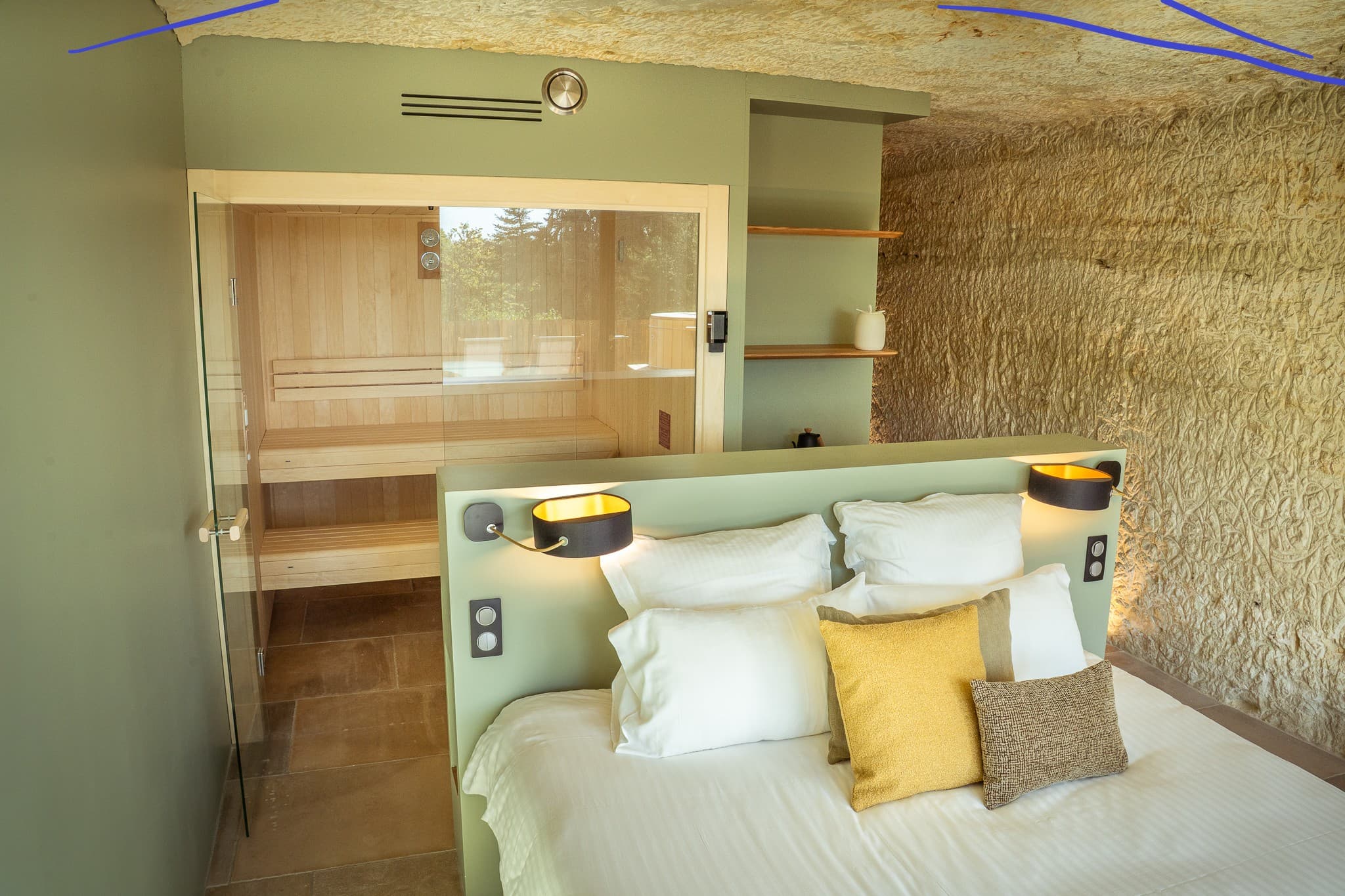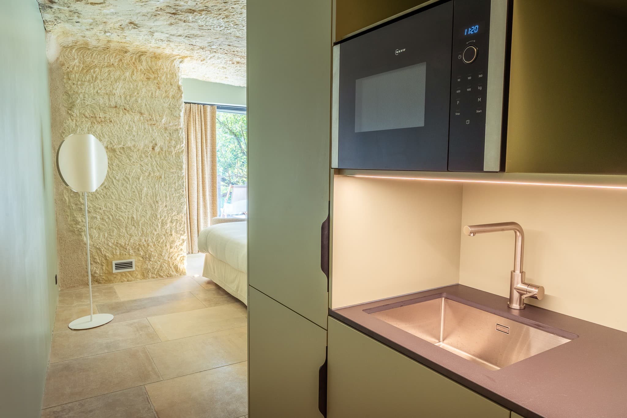 Our four new contemporary suites offer a unique experience combining comfort and authentic materials. Perched high on a hillside, facing south and southwest, they have been recently carved into the tufa stone and are flooded with light. The interior temperature remains constant throughout the year.